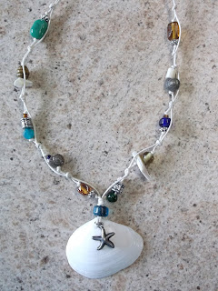 "A Day at the beach " With a 2 inch clam shell , starfish trinket , glass , metal , wood , shell and bone beads ...This necklace is truly a FIND