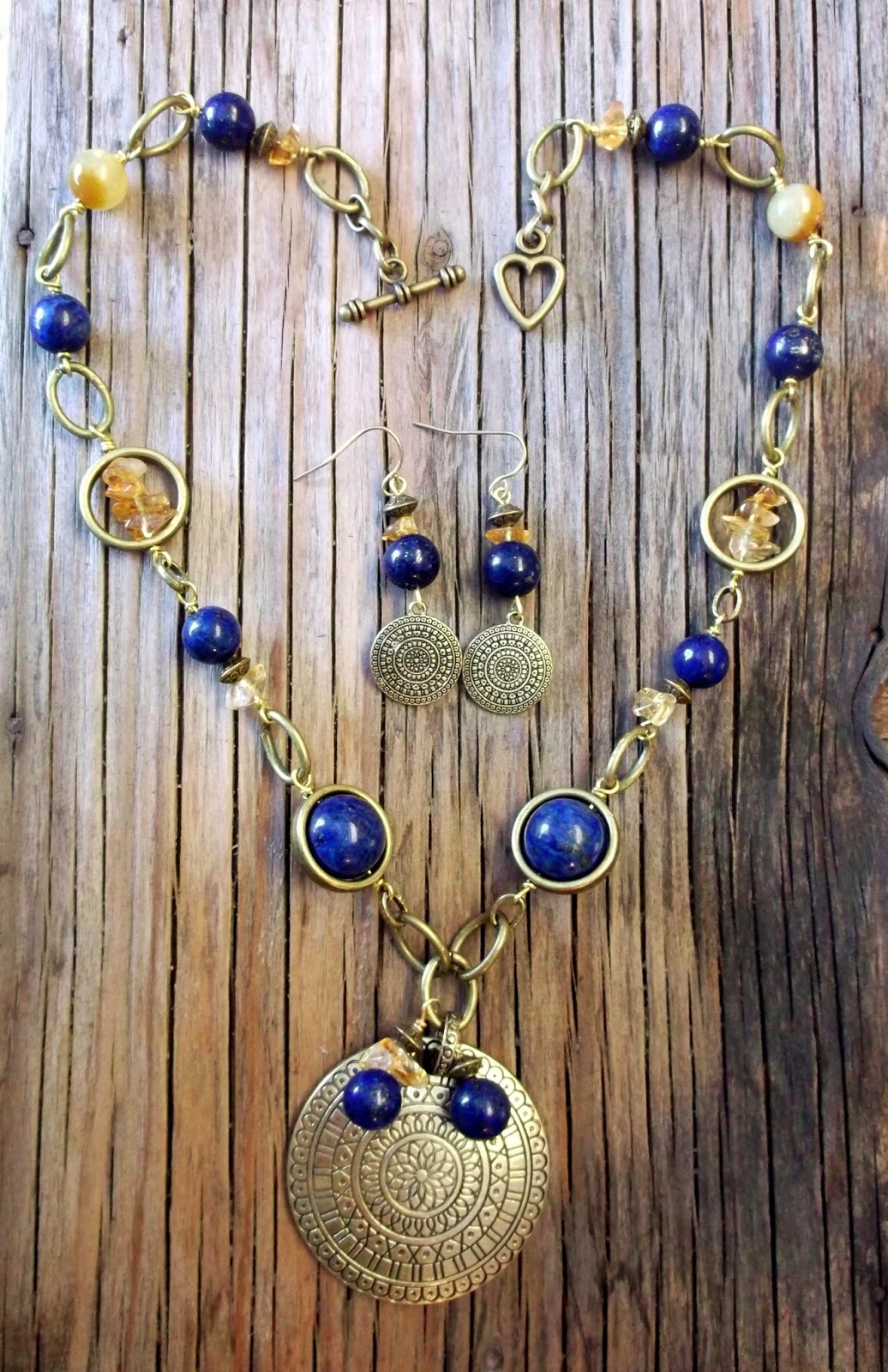 Lapis lazuli , Citrine and Fire Agate earring and necklace set with detailed Brass Medallions . This is a beautiful piece a one of a kind , each link has been made onto the next making this necklace very strong . Measuring 18 inches long with a 2 inch drop ... the earrings are 2 inches long . Inspired by a beautiful blue eyed golden haired lady . For Sale !